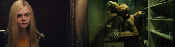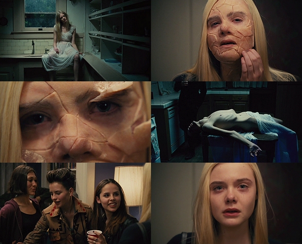 Erst in der dritten Minute wird preisgegeben, dass sich das Bisherige aus der Perspektive einer Jugendlichen (Elle Fanning) heraus entfaltet hat, welche nun ein Badezimmer betritt, sich in diesem stracks vor den Spiegel begibt sowie Mascara aufzutragen anfängt. Ein paar Sekunden später hält sie plötzlich jedoch inne – sieht sich für einen Moment einfach nur die Reflektion ihres Antlitzes an, welches sich unmittelbar darauf abrupt verändert: Auf einmal besteht ihr Gesicht bloß noch aus groben, uneben an-, über- und miteinander verwachsenen Hautstücken. Tränen bilden sich in ihren Augen, fließen eine ihrer Wangen hinunter – wonach sie damit beginnt, an einigen Rändern der „Fetzen“ zu kratzen und diese dann auch abzureißen: Eine unverkennbar schmerzhafte Angelegenheit. Ihre Schreie gehen einem durch Mark und Bein – bis alles jäh vorüber ist. Verweint betrachtet sie sich erneut: Inzwischen wieder ihr natürliches Aussehen aufweisend, steigt „dennoch“ Übelkeit in ihr auf – weshalb sie hinüber zur Toilette stolpert und sich dort übergibt. Eindringlich, unangenehm beizuwohnen sowie handwerklich achtbar umgesetzt, wird auf jenem Wege die verzerrte Selbstwahrnehmung dieser Heranwachsenden veranschaulicht – und das ebenso ausdrucksvoll wie nachempfindbar…